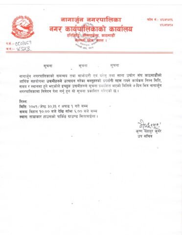 २०८१ साल जेठ ३०, ३१ र असार १ गते तीन दिनसम्म उत्पादित वस्तुको प्रदर्शनिमा राख्न लागेको नगरपालिकाले सोमबार सूचना जारी गरी जनाएको छ । सीतपाइला स्थित ताम्राकार हाउसको पार्किङ ग्राउन्डमा उद्यमीहरुले उत्पादन गरेका सामानको स्टल राखिने नागार्जुन नगरपालिकाले जनाएको छ ।
