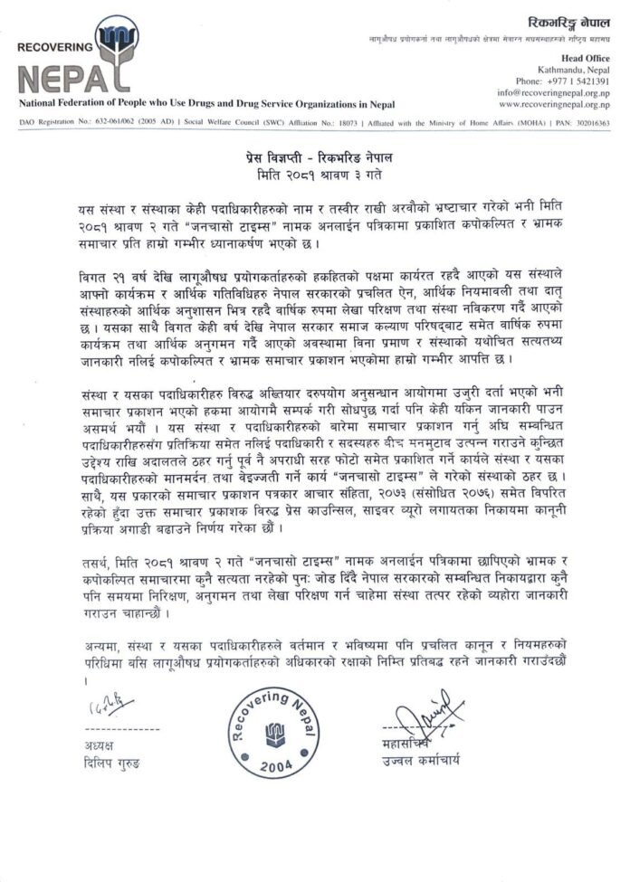 संस्थाको अध्यक्षको हस्ताक्षर भएको विज्ञप्तिमा भनिएको छ विगत २१ वर्ष देखि लागू औषध प्रयोगकर्ताहरूको हकहितको पक्षमा कार्यरत रहँदै आएको यस संस्थाले आफ्नो कार्यक्रम र आर्थिक गतिविधिहरू नेपाल सरकारको प्रचलित ऐन, आर्थिक नियमावली तथा दातृ संस्थाहरूको आर्थिक अनुशासन भित्र रहँदै वार्षिक रूपमा लेखा परीक्षण तथा संस्था नवीकरण गर्दै आएको छ । यसका साथै विगत केही वर्ष देखि नेपाल सरकार समाज कल्याण परिषद्बाट समेत वार्षिक रूपमा कार्यक्रम तथा आर्थिक अनुगमन गर्दै आएको अवस्थामा विना प्रमाण र संस्थाको यथोचित सत्य तथ्य जानकारी नलिई कपोकल्पित र भ्रामक समाचार प्रकाशन भएकोमा हाम्रो गम्भीर आपत्ति छ ।