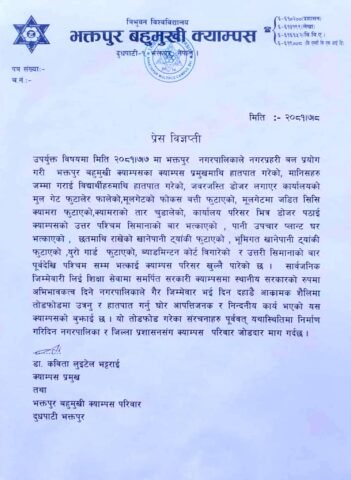 त्रिभुवन विश्व विद्यालयको आङ्गिक क्याम्पस भक्तपुर क्याम्पसको नाममा रहेको जग्गा नै नगरपालिकाले आफ्नो भएको भन्दै क्याम्पसले अनानिग्रित रूपमा पर्खाल र गेट निर्माण गरेको भन्दै भत्काएको हो ।