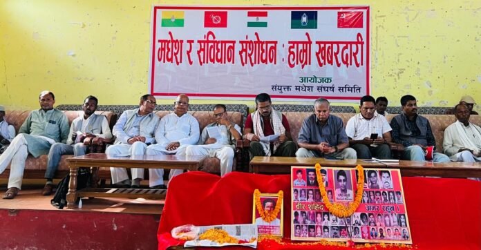 जलेश्वर । संयुक्त मधेश संघर्ष समितिले आज महोत्तरीको जलेश्वरमा नेपाली काँग्रेस र नेकपा एमाले द्वारा प्रस्तावित संविधान संशोधनको बिरुद्ध खबरदारी सभा गरेको छ । संयुक्त मधेश संघर्ष समिति प्रतिनिधि सभाबाट समानुपातिक समावेशी प्रतिनिधित्व हटाउने, थ्रेसहोल्डलाई १०% सम्म बढाउने, राष्ट्रिय सभाको वर्तमान प्रतिनिधित्वको स्वरुप बदल्ने जस्ता कुरालाई संविधानको प्रतिगामी संशोधनको प्रस्ताव भनेको छ । पहिचान आधारित प्रदेशको सीमांकन,पूर्ण समावेशी समानुपातिक पद्धति र निर्वाचन क्षेत्रको रुपमा प्रदेश, थ्रेस होल्डको समाप्ति, राष्ट्रिय सभाको वर्तमान स्वरुपमै जनसंख्याको हिसाबले प्रदेशहरुबाट प्रतिनिधित्व, प्रादेशिक राजनीतिक दलहरुको मान्यता, तथा राज्यका अंगहरुमा समानुपातिक समावेशी उपस्थिति संयुक्त मधेश संघर्ष समितिका मांगहर रहेका छन् । समितिमा तराई-मधेश लोकतान्त्रिक पार्टी, मधेशी राष्ट्रीय मुक्ति मोर्चा नेपाल, नेपाल सद्भावना पार्टी, जनअधिकार पार्टी र एकीकृत समाजवादी पार्टीका समान विचारका नेताहरू शामिल छन् । समितिले यस अघि भाद्र ३१ गते धनुषाको जनकपुरधाममा पहिलो खबरदारी सभा गरेको थियो । मधेशको ठूलो पर्व छठ सकिने बित्तिक्कै सबै जिल्लाहरु खबरदारी सभा सम्पन्न गर्ने र त्यसपछि कार्यक्रमको अर्को चरणमा प्रवेश गर्ने तमलोपाका प्रचार विभाग प्रमुख उमेश मण्डल ले बताए ।