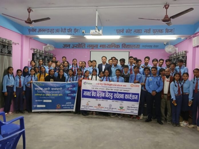 रौतहट । चन्द्रपुर नगरपालिकाको जनज्योति नमुना माध्यमिक विद्यालयका कक्षा १० मा अध्ययनरत बालबालिकाहरूलाई मानव बेचबिखन विरुद्धको सचेतना गराइएको छ । लैङ्गिक हिंसा विरुद्धको १६ दिने अभियानको दोस्रो दिन विद्यार्थी बिच सचेतनामूलक कार्यक्रम गरिएको हो । कार्यक्रममा मानव बेचबिखन भनेको के हो र मानव बेचबिखन तथा ओसार प्रसारका प्रमुख कारणहरू आपराधिक प्रवृत्ति रु मानव बेचबिखन तथा ओसार पसारमा संलग्न हुन सक्ने व्यक्तिहरू रु मानव बेचबिखन गर्ने तरिका,सीमावर्ती नाकामा अपराधीहरूबाट गरिने बाहानाहरु , दलालले प्रयोग गर्ने तरिका र दण्ड सजायको बारेमा जानकारी गराइएको थियो । त्यस्तै लैङ्गिक हिंसा, घरेलु हिंसा, महिलाहरूलाई श्रोत साधनहरू माथि पहुँच र नियन्त्रण, महिला सशक्तीकरणका कुराहरू उदाहरण सहितका कुराको जानकारी गराइएको थियो । सो कार्यक्रममा इलाका प्रहरी कार्यालयका प्रहरी निरीक्षक साजन कुमार शर्मा र संरक्षण नेपाल शाखाका लैङ्गिक समानता र समावेशी (जिसी) अधिकृत भाग्यनारायण महतोले सहजीकरण गरेका थिए । कार्यक्रममा महिला सुरक्षा दबाब समूहका अध्यक्ष तथा महिला हिंसा नियन्त्रण जिल्ला सञ्जालका सदस्य देवकी नेपालले लैङ्गिक हिंसा विरुद्धको १६ दिने अभियानको इतिहास र वर्तमान रौतहट जिल्लाको अवस्थाको बारेमा आफ्ना विचारहरू राखेका थिए । सय जना बालबालिकाको उपस्थितिमा प्रधानाध्यापक देवनारायण हुमागाँइको अध्यक्षतामा भएको कार्यक्रम संरक्षण नेपालको सहयोग,इलाका प्रहरी कार्यालय चन्द्रनिगाहपुरको आयोजना तथा चन्द्रपुर नगरपालिकाको समन्वयमा सञ्चालन गरिएको थियो ।