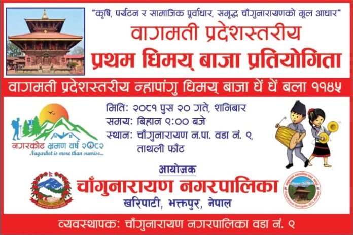 भक्तपुर, १७ पुस। चाँगुनारायण नगरपालिकाले गर्ने वागमती प्रदेशस्तरीय प्रथम धिमे बाजा प्रतियोगितामा ऐतिहासिक सहभागिता भएको छ। सांस्कृतिक, ऐतिहासिक र पुरातात्त्विक महत्वकाे चाँगुनारायण नगरपालिकाले पुस २० गते ताथलीमा गर्ने उक्त प्रतियोगितामा ऐतिहासिक सहभागिता भएको नगरपालिकाले जनाएको छ ।