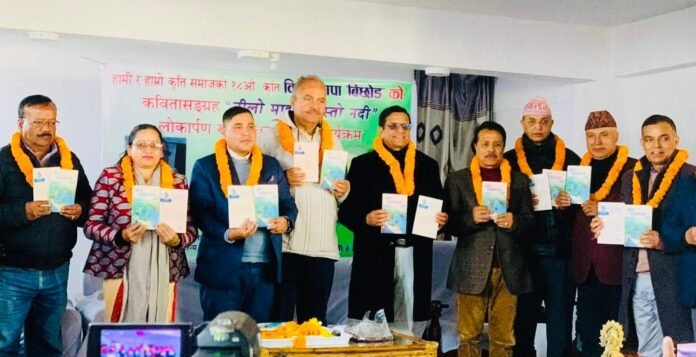 ‘नीलो माइक्रोजस्तो नदी’ लोकार्पण गर्दै प्राडा रामप्रसाद ज्ञवाली, डा कौशिला रिसाल, डा विनोद मञ्जन, प्रोल्लास सिन्धुलीय लगायत ।