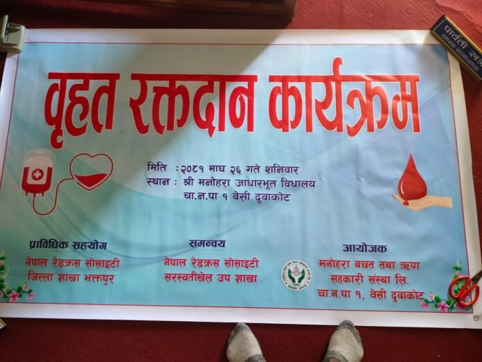 भक्तपुर । मनोहरा बचत तथा ऋण सहकारी संस्था लि, चाँगुनारायण नगरपालिका–१, वेसी दुवाकोट को आयोजनामा वृहत रक्तदान कार्यक्रम हुने भएको छ।