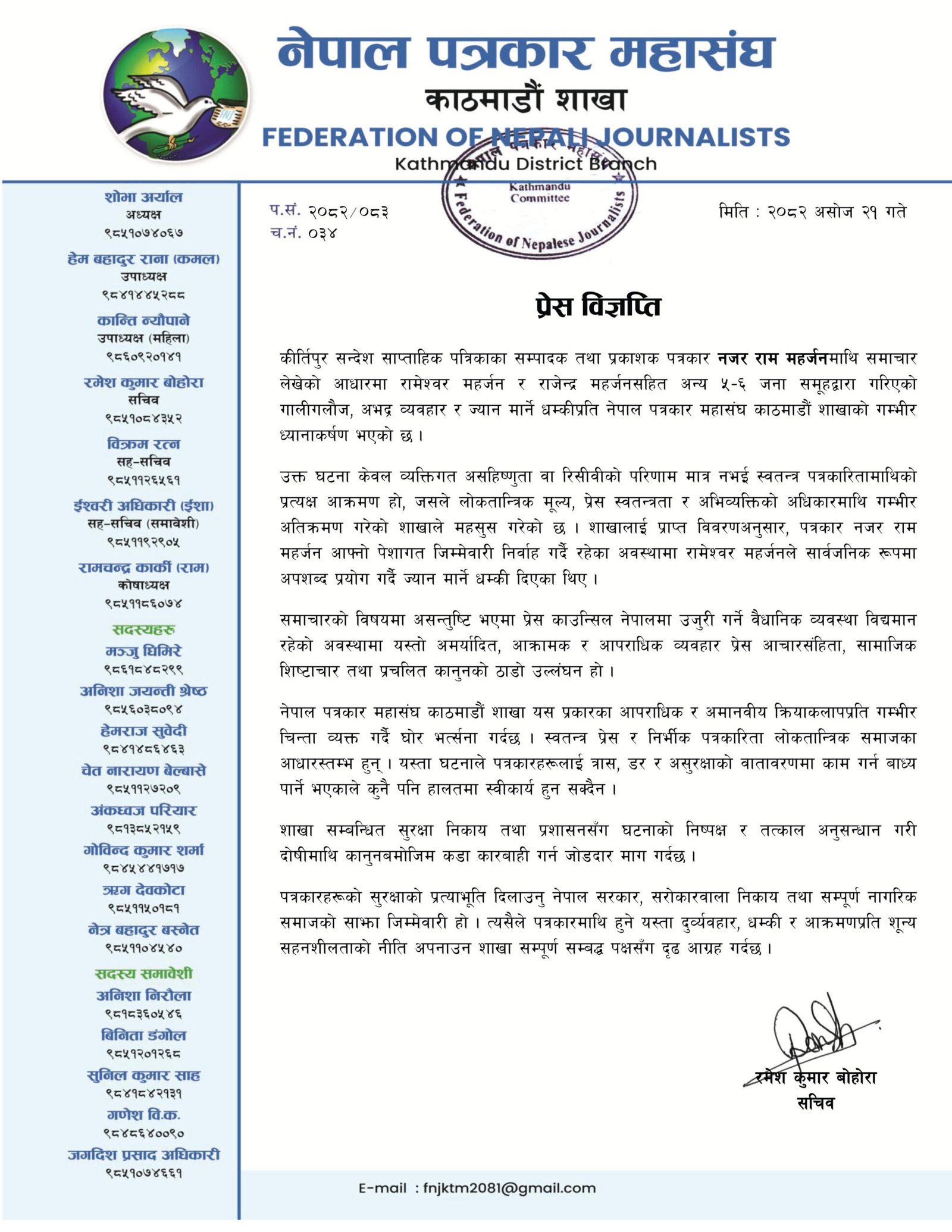 विज्ञप्तिमा भनिएको छ “नेपाल पत्रकार महासंघ काठमाडौं शाखा यस प्रकारका आपराधिक र अमानवीय क्रियाकलापप्रति गम्भीर चिन्ता व्यक्त गर्दै घोर भर्त्सना गर्दछ । स्वतन्त्र प्रेस र निर्भीक पत्रकारिता लोकतान्त्रिक समाजका आधारस्तम्भ हुन् । यस्ता घटनाले पत्रकारहरूलाई त्रास, डर र असुरक्षाको वातावरणमा काम गर्न बाध्य पार्ने भएकाले कुनै पनि हालतमा स्वीकार्य हुन सक्दैन ।”