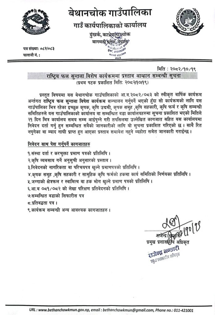 बेथानचोक गाउँपालिकाद्वारा राष्ट्रिय फल सुन्तला विशेष कार्यक्रमका लागि प्रस्ताव माग