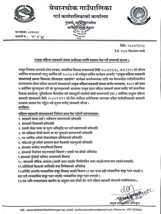 मन्त्रालयको चालु आर्थिक वर्ष २०८२/८३ को स्वीकृत कार्यक्रमअनुसार उत्कृष्ट महिला सहकारी संस्थालाई क्षमता विकास तथा प्रोत्साहन सहयोग कार्यक्रम कार्यान्वयन गर्न बेथानचोक गाउँपालिका भित्र सञ्चालनमा रहेका महिला सहकारी संस्थामध्येबाट मापदण्डका आधारमा उत्कृष्ट संस्था छनोट गरिने सूचनामा उल्लेख गरिएको छ।