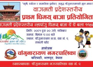 भक्तपुर । बागमती प्रदेश स्तरिय धिम्य बाजा प्रतियोगिताको तयारी पुरा भएको आयोजकले जानकारी दिएका छन् । चाँगुनारायण नगरपालिका वडा नम्वर ९ ताथलीमा आयोजना हुने उक्त प्रतियोगिताको तयारी पुरा भएको आयोजकले जानकारी दिएका हुन् ।