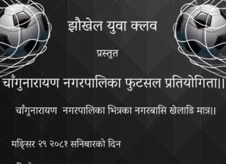 चाँगुनारायण । चाँगुनारायण नगर स्तरीय फुटसल प्रतियोगिता हुने भएको छ । झौखेल युवा क्लबको आयोजनामा आगामी मङ्सिर २९ गते शनिवारको दिन नगरपालिकाका विभिन्न टिमहरू बिच फुटसल प्रतियोगिता हुन लागेको हो ।
